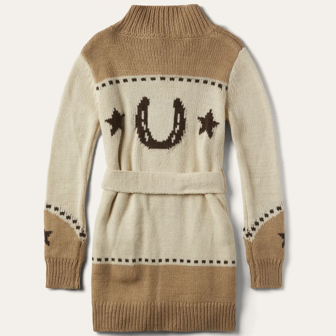 Celebrating Stetson’s rich tradition of Western style, this white and cream belted cardigan sweater features a vintage horseshoe and star motif. It has wide-ribbing at the collar, front placket, sleeves and hems, a self tie waist and large dress maker snap closure. Made from a cozy wool blend, it has a flowing, easy drape that pairs perfectly over your favorite jeans.