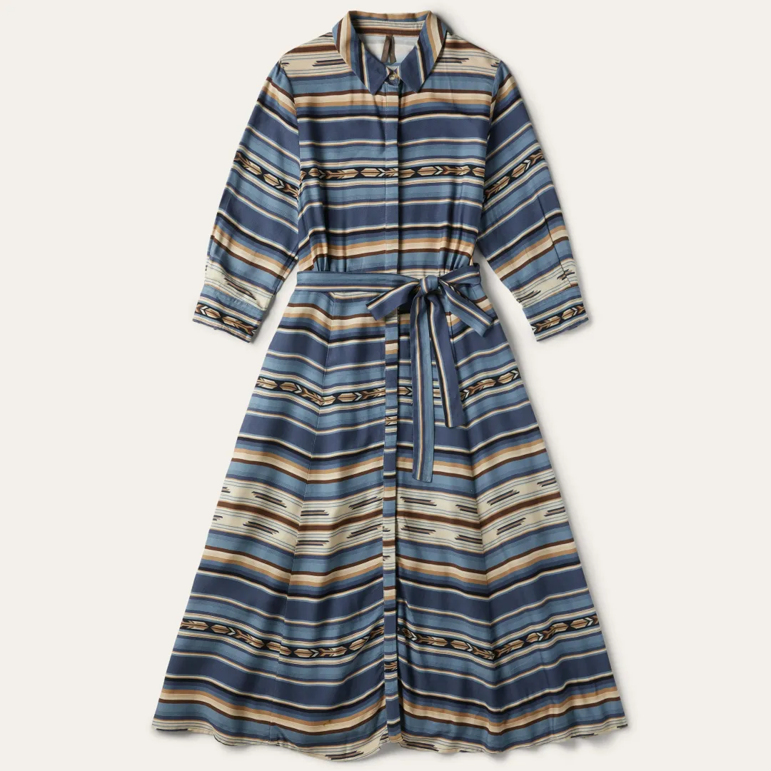 This mid-length dress is woven from 100% rayon twill and features an Indigo Serape print. It has a fold down collar with a full-length hidden button placket closure, elbow-length sleeves with gathers and button cuffs, a fitted waistline with gathers and self fabric tie and a partially lined skirt with side slits.