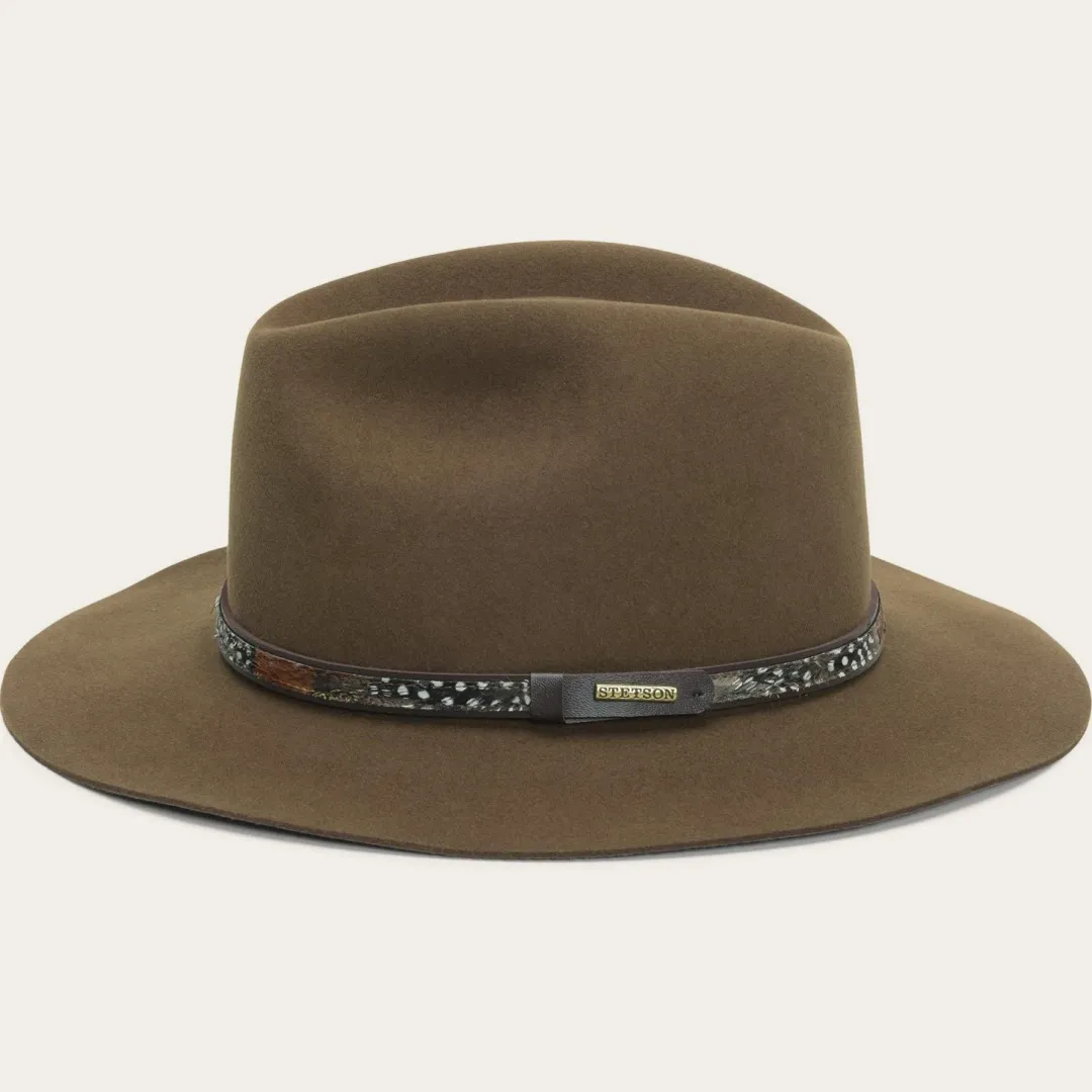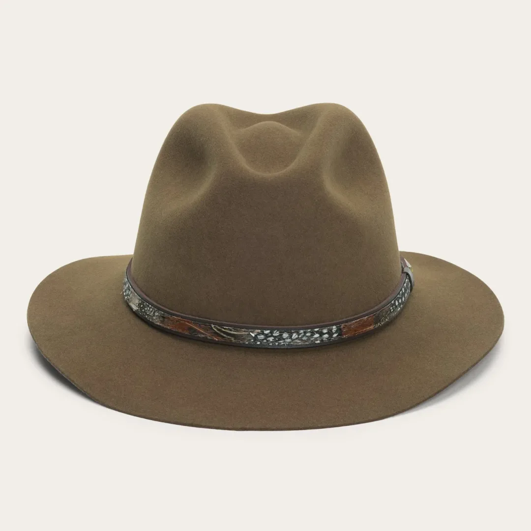 One look at the Jackson will have you dreaming of getting outside, off the beaten trail, and into the wild. Beloved for both its practicality and unique style, it’s the perfect hat to pull on before heading into the unknown. Made from a blend of quality felt and soft merino wool, it’s water-resistant, lightweight, and easy to care for. Dyed in two handsome shades inspired by nature’s warmth — Bronze and Sage — it features a subtle pinch-front crown and slender bound-edge brim. At once discreet and distinctive, the eye-catching hatband is accented with natural quail feathers for a subtle dose of texture and color. An outdoor essential that’s made to last, the Jackson is a top choice for heading into the hills, camping, and more.
