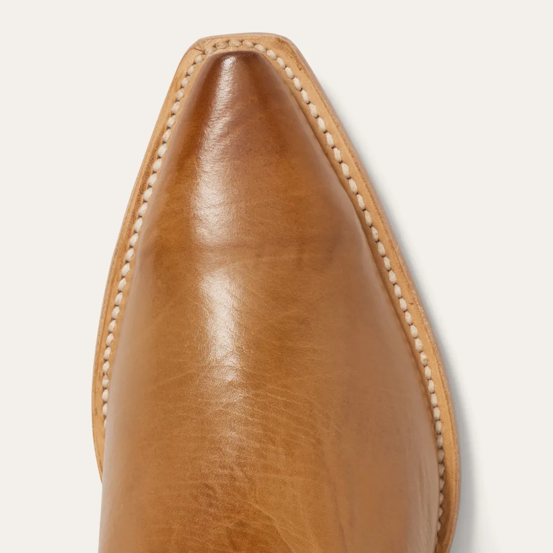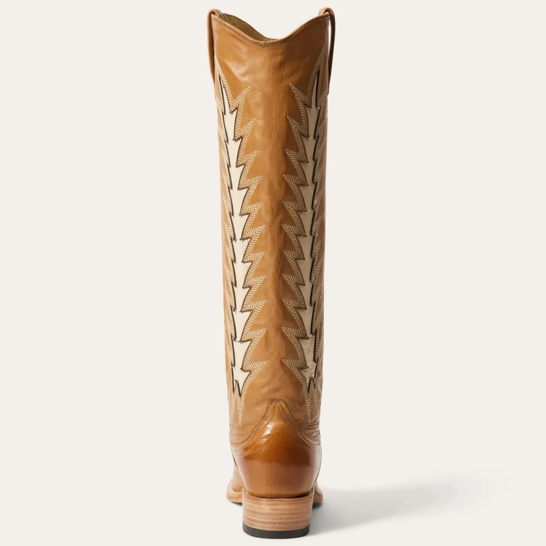 The statement-making Johnnie Boots have a gold calf vamp and 16” shaft and a unique vintage flame underlay. Additional details include a stacked heel, premium leather lining, premium brass nails and hand-driven lemonwood pegs that enable the boot to withstand the elements by expanding and contracting with any moisture the boot may encounter. Our western boots are handcrafted with the same care and consideration that goes into our legendary headwear, resulting in the ultimate mix of heel-to-toe comfort, durability, and classic Western style. Their rugged construction is fit for a lifetime of adventure, with high-quality leathers that will develop an attractive patina over time and conform to the wearer, providing years of reliable service.