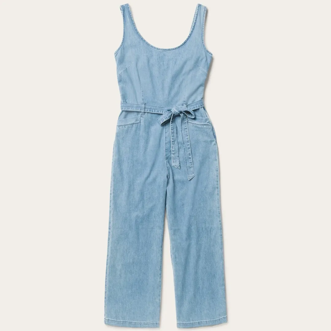 On trend in the desert or the city, this straight-leg jumpsuit features a straight low back with hidden buttons for strap length adjustment, back patch pockets and angled front pockets.