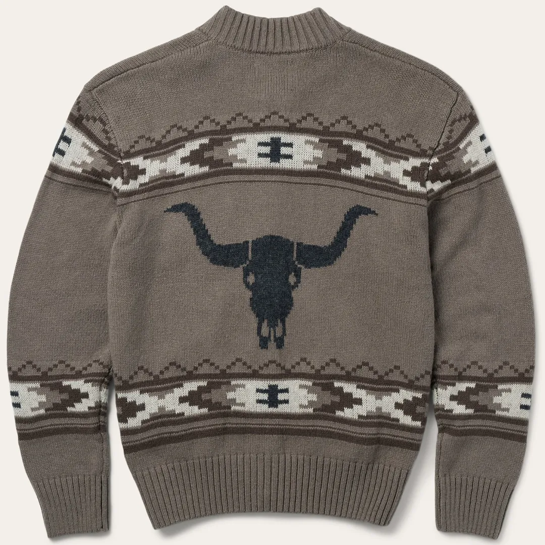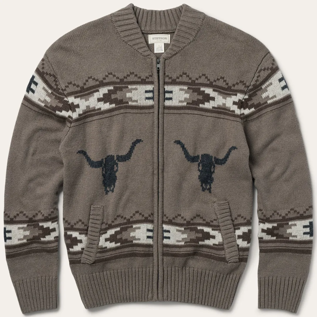 This brown zip-front cardigan sweater gives a nod to Stetson’s long-standing Western heritage with a Longhorn Steer motif alongside an Aztec-inspired print. It has two front hand pockets and a self-knitted collar, cuffs and waistband. Made from a wool blend, it provides warmth, comfort, and rugged style whenever the weather calls for an extra layer.