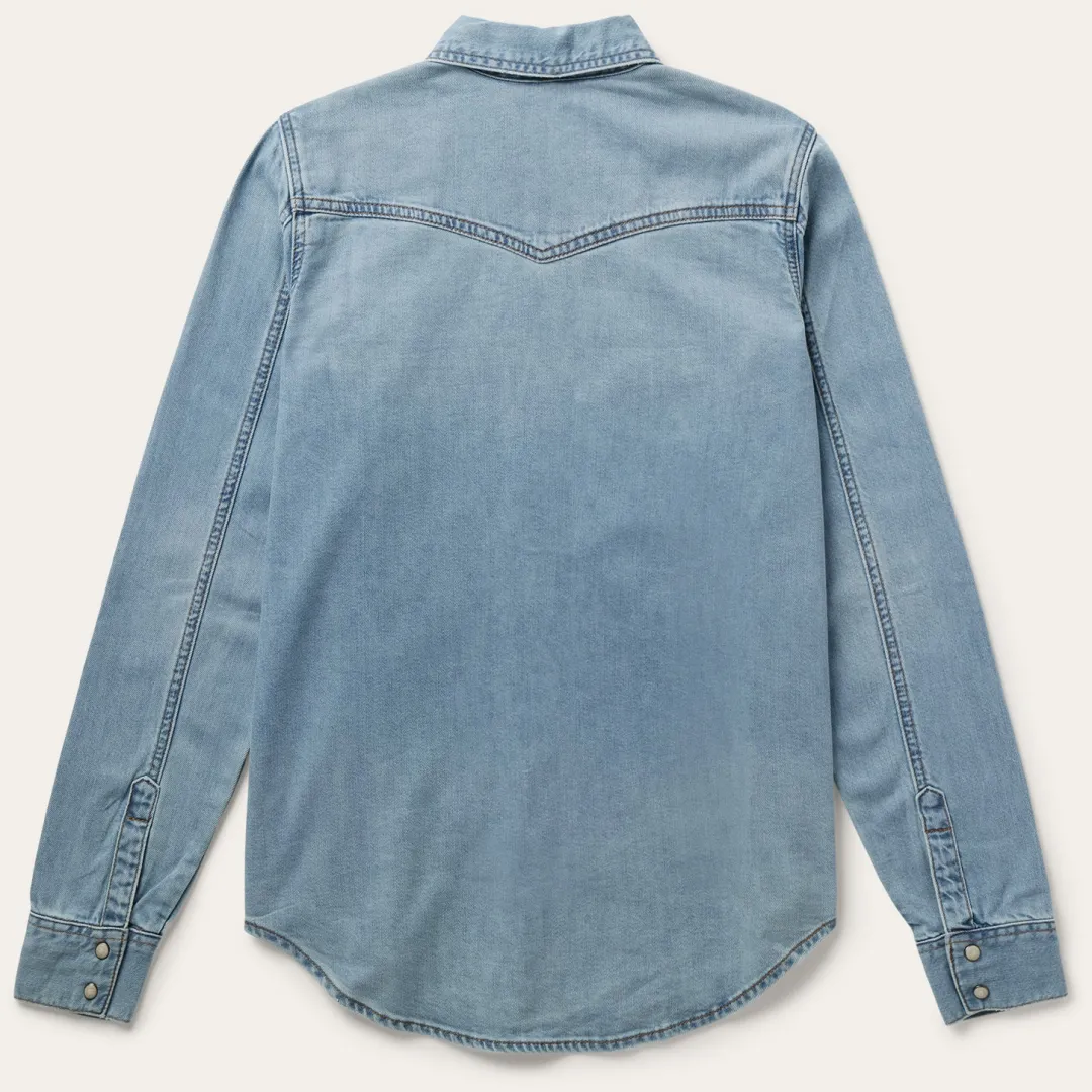 This classic Western-style denim blouse is crafted from 100% cotton and features a loose fit for comfort and freedom of movement. It features two front patch pockets with sawtooth snap closure flaps, deep V single point front yokes and a curved single point back yoke whose seam extends down the sleeves to the cuffs. Additional authentic details include gold contrast top stitching and a shirttail bottom hem.