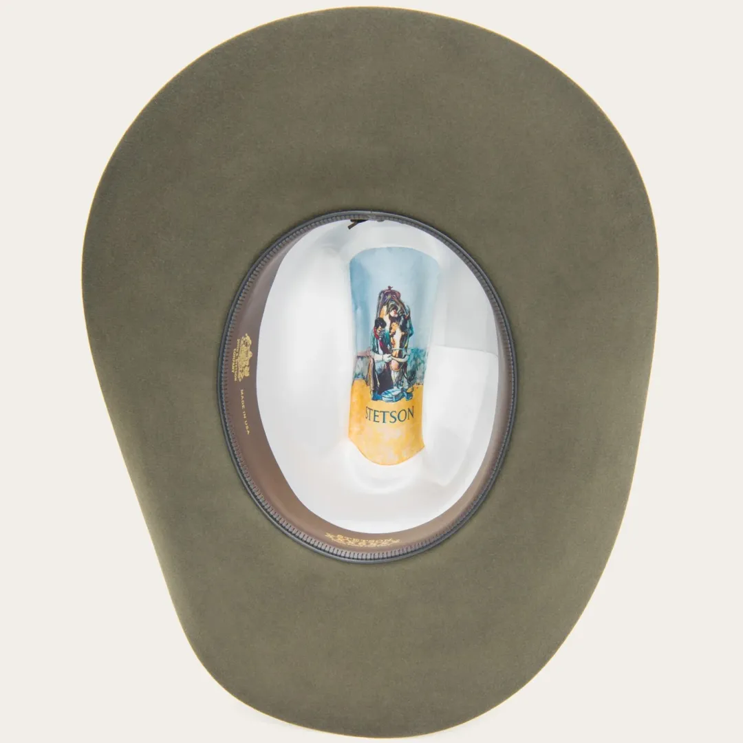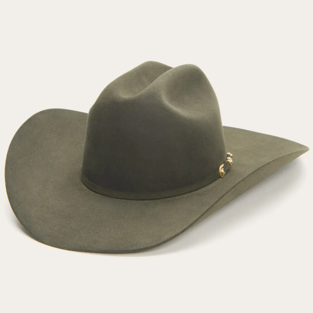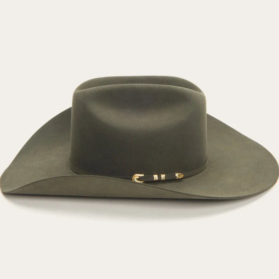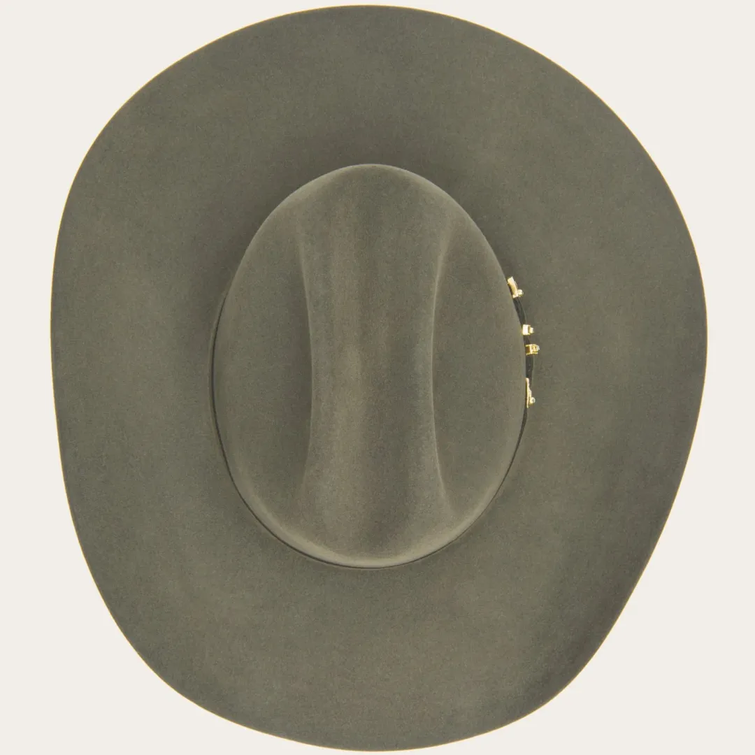 Stand out from the crowd in the Stetson Sage Munford hat. The classic and refined style is a textured staple, made of genuine 6x fur felt material. The matching hatband is accented by the focal point of this hat, the gold and silver buckle set dotted by green stones that set the entire look apart. Add this unparalleled and timeless beauty to your collection for a true western look.