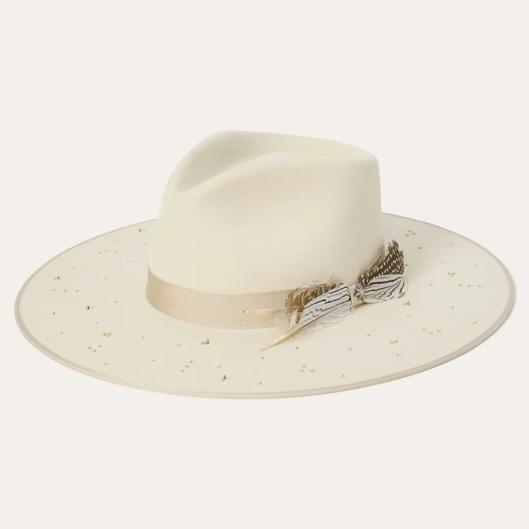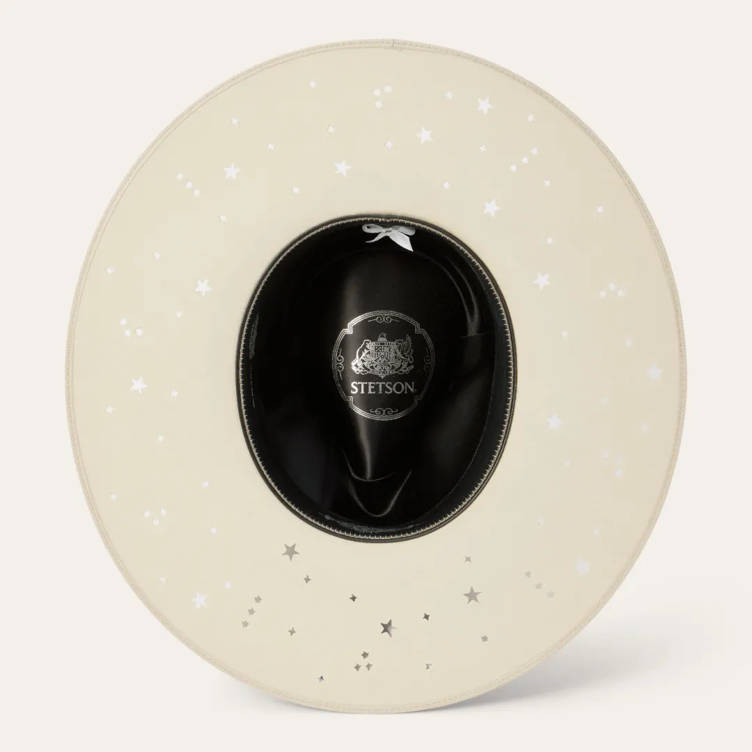 This unique fedora features distinctive star cutouts perforated onto its flat brim that cast a subtle constellation of light wherever you go. Its statement-making style features a 4 ½” teardrop pinch front crown that is finished with a wide grosgrain band, a custom STETSON star pin and removable feather detail. Crafted in high-quality 100% wool with a firm finish, it has a full satin liner and genuine leather sweatband to ensure a comfortable and secure fit. Part of our Seeker Collection, it’s made for those with a wandering, frontier spirit and a fitful reminder to always follow the stars.