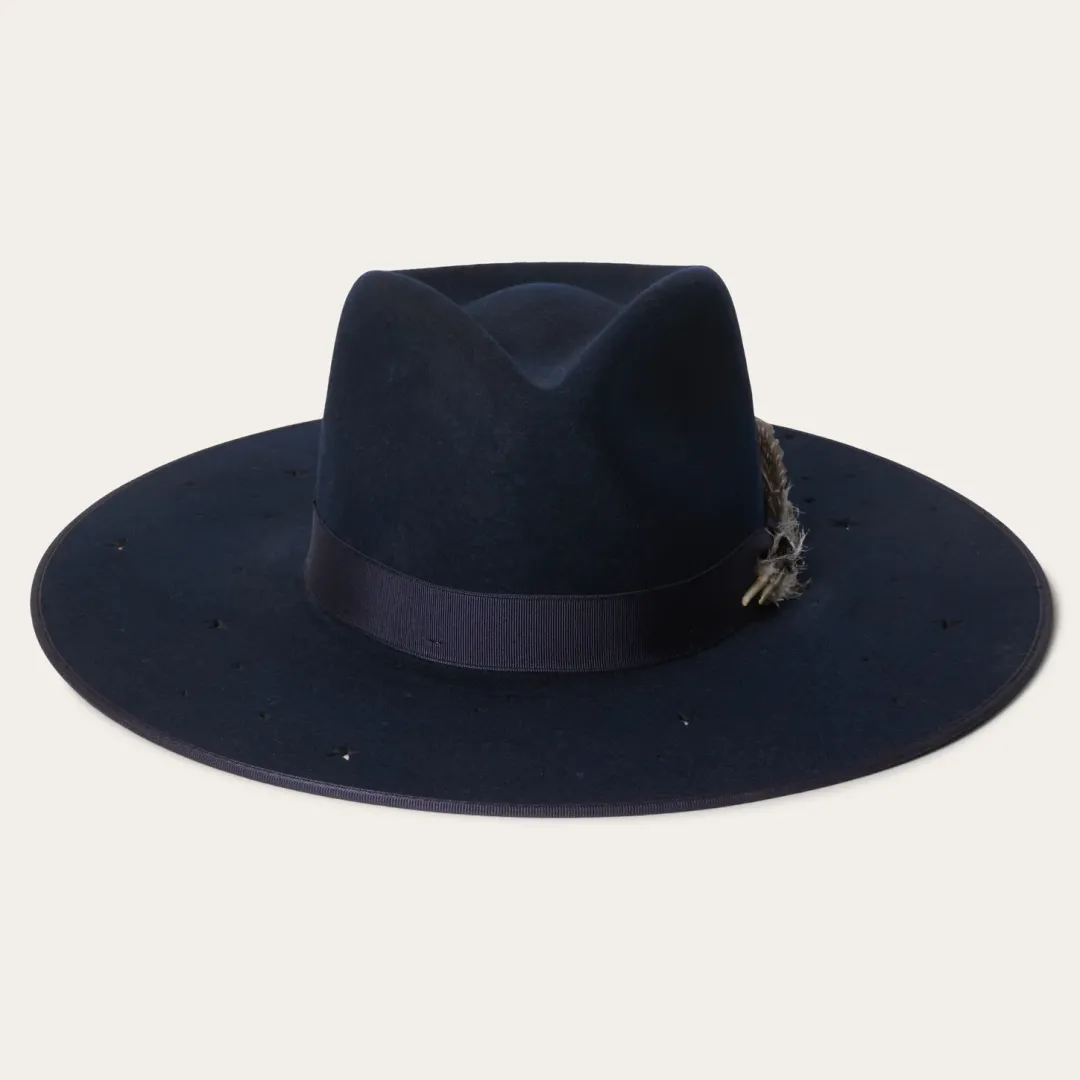 This unique hat features distinctive star cutouts on its wide, flat brim, along with both a feather and a custom Stetson Star Pin on the grosgrain hat band. This hat is crafted with firm felt, and a high-quality leather sweatband at the interior.