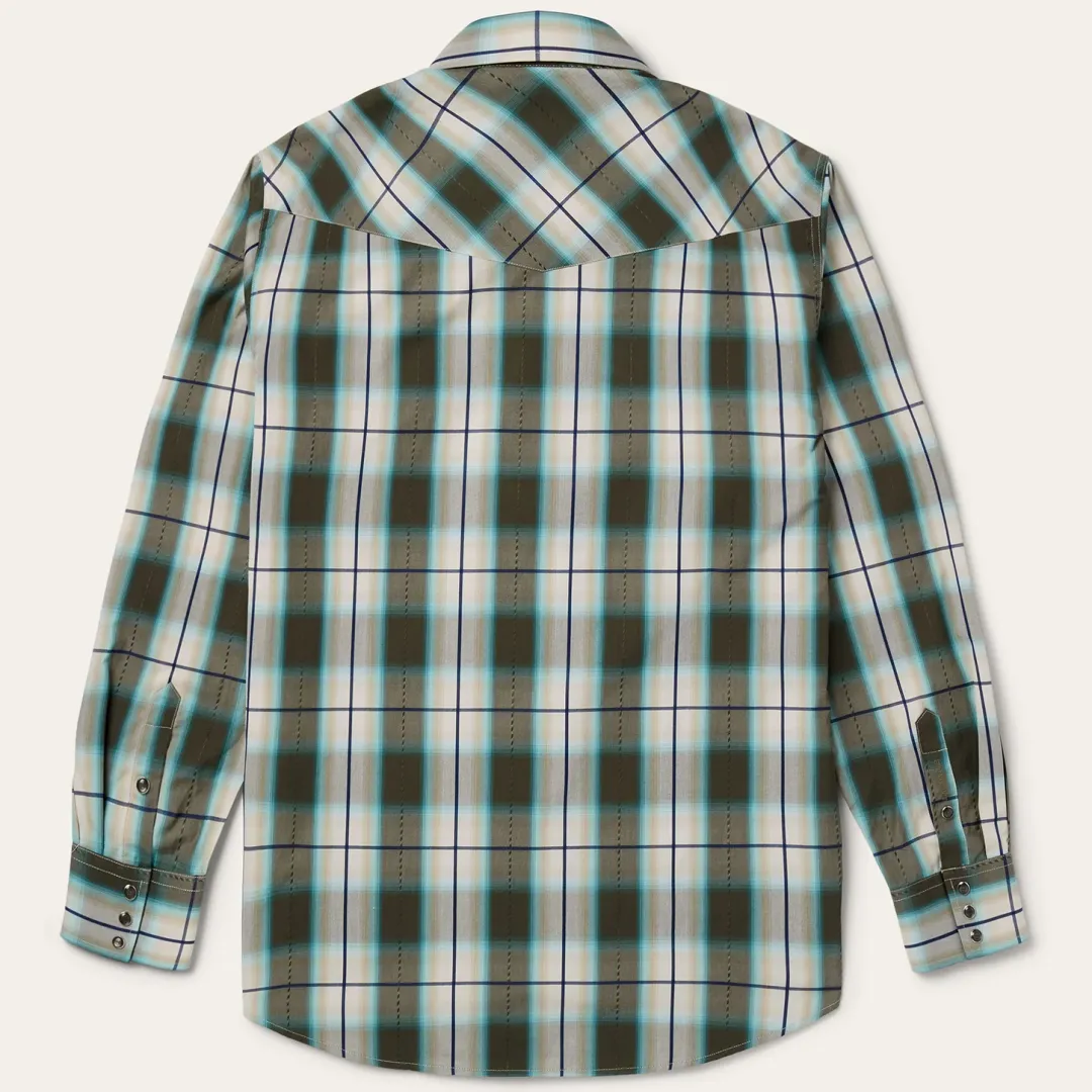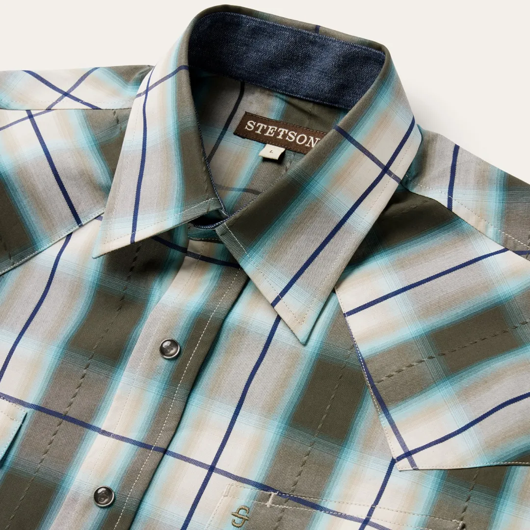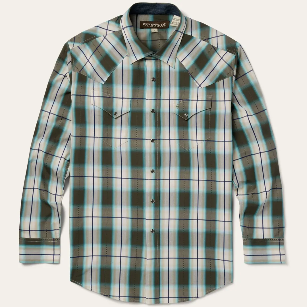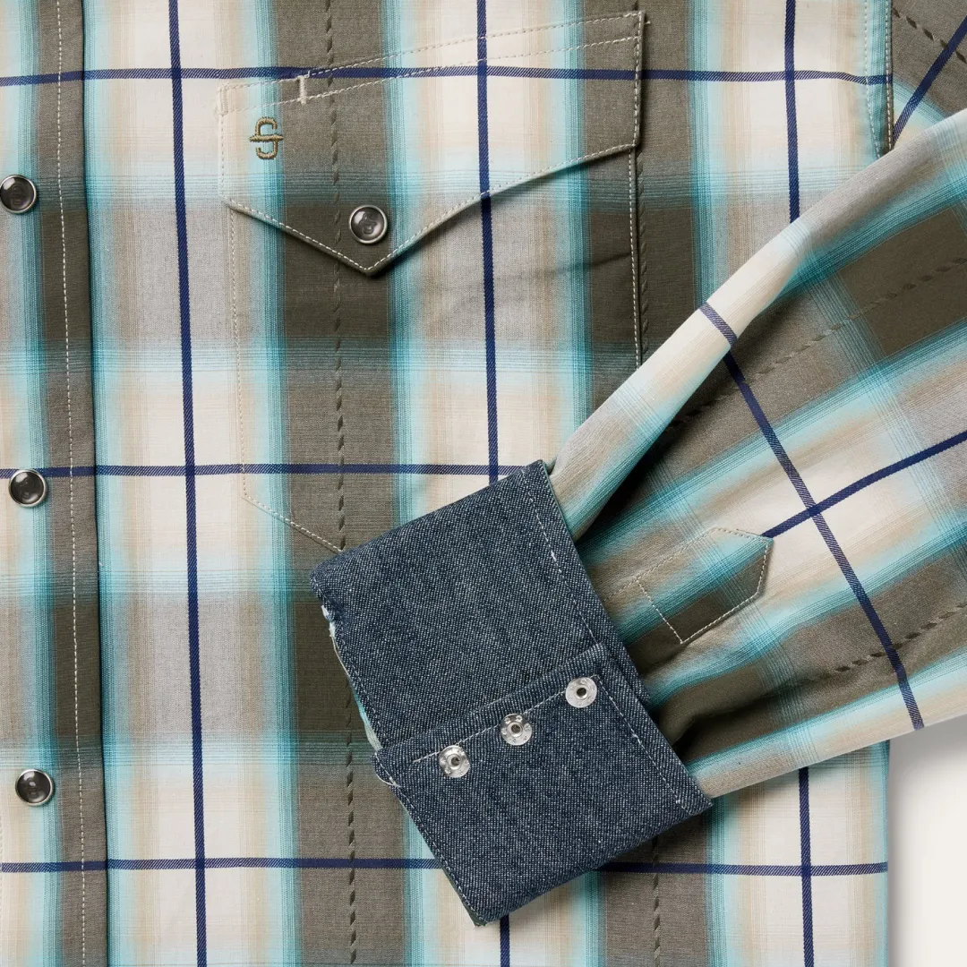 This snap front western shirt is crafted from 100% cotton and features a yarn-dyed olive ombre plaid with dobby stitch. It has asymmetrical snap-closure pockets with flaps, a spread collar,contrast denim inside trim and a one point back yoke.
