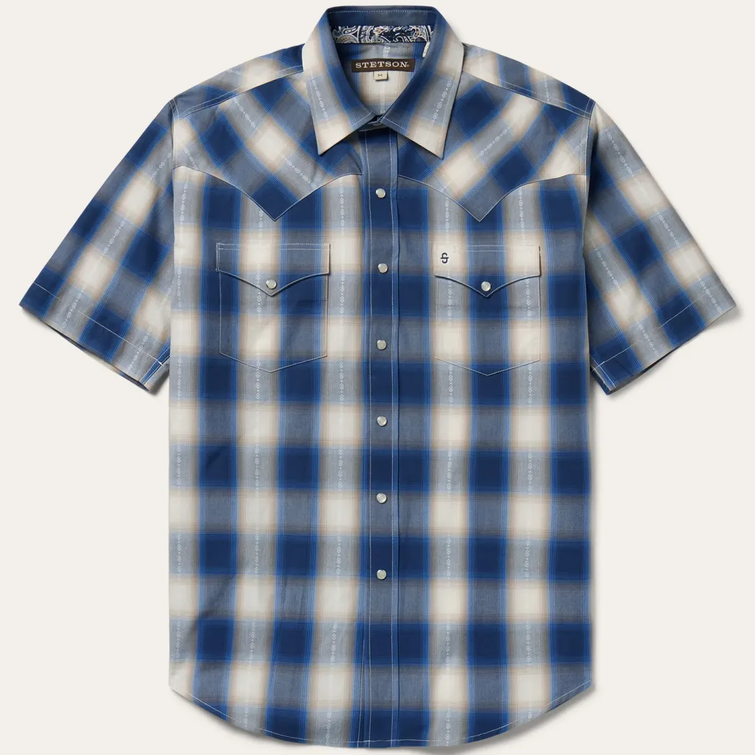 This short-sleeved western shirt is crafted from a yarn dyed cotton dobby and features our exclusive Blue Ombre plaid. It has a one point ultra deep curved back yoke, the Stetson “S” embroidered on the front left pocket, and “STETSON” embroidered on the right sleeve placket. The classic snap front features logo pearl snaps and is finished with contrast inside trim.