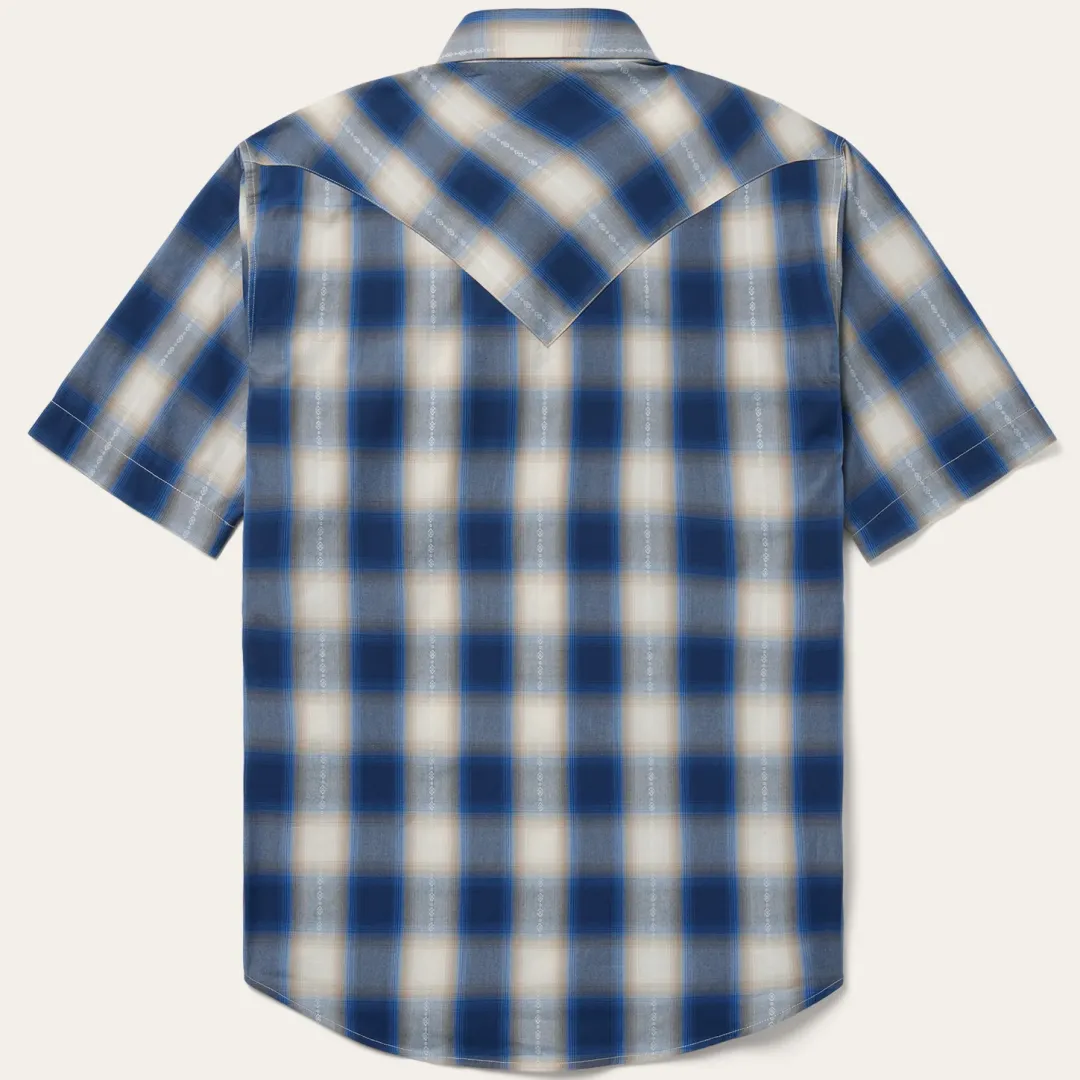 This short-sleeved western shirt is crafted from a yarn dyed cotton dobby and features our exclusive Blue Ombre plaid. It has a one point ultra deep curved back yoke, the Stetson “S” embroidered on the front left pocket, and “STETSON” embroidered on the right sleeve placket. The classic snap front features logo pearl snaps and is finished with contrast inside trim.