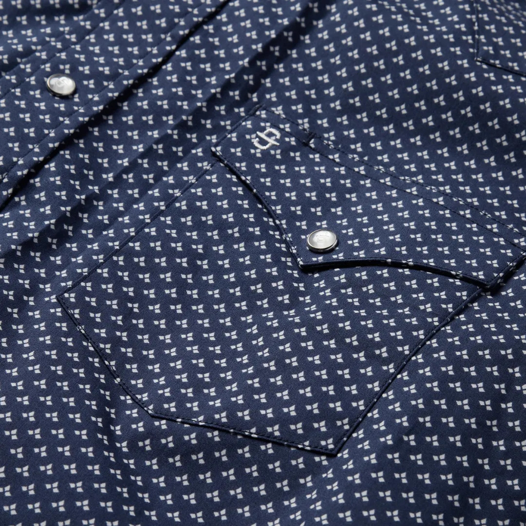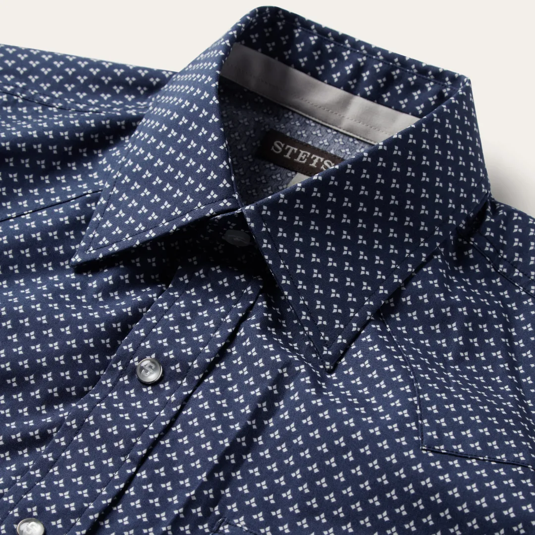 Woven from crisp cotton poplin, this snap front Western shirt features our allover Polaris Geo print in a rich blue color. It has a one-point, ultra-deep, curved back yoke, pearl logo snaps. contrasting khaki poplin inside trim, the Stetson “S” embossed on the front left pocket, and STETSON embossed on the right sleeve placket. Cut trim, for a modern fit.