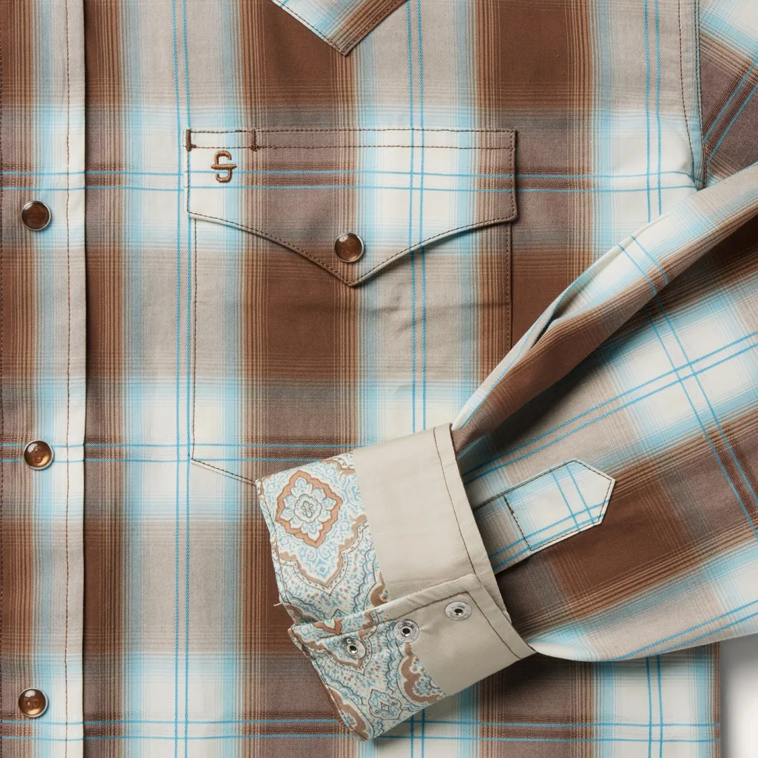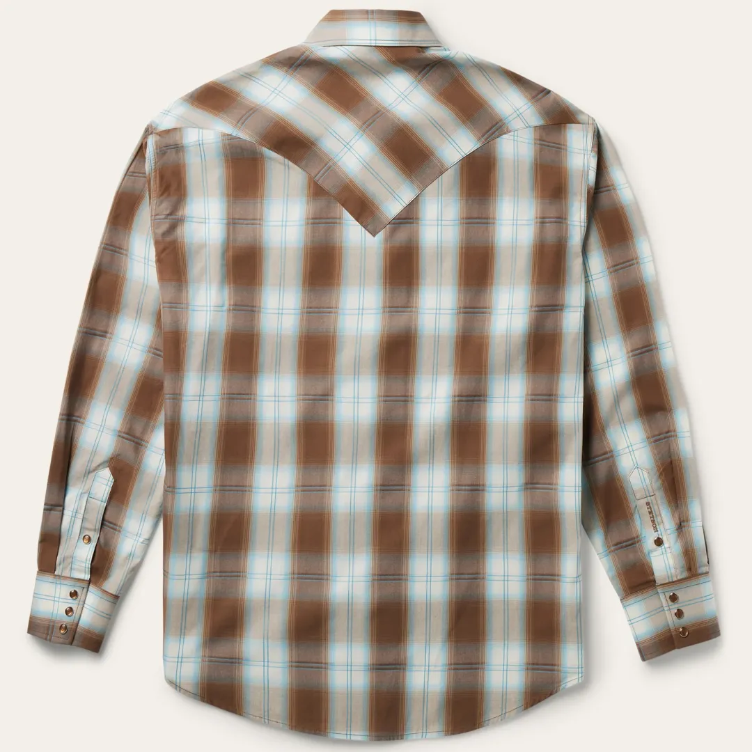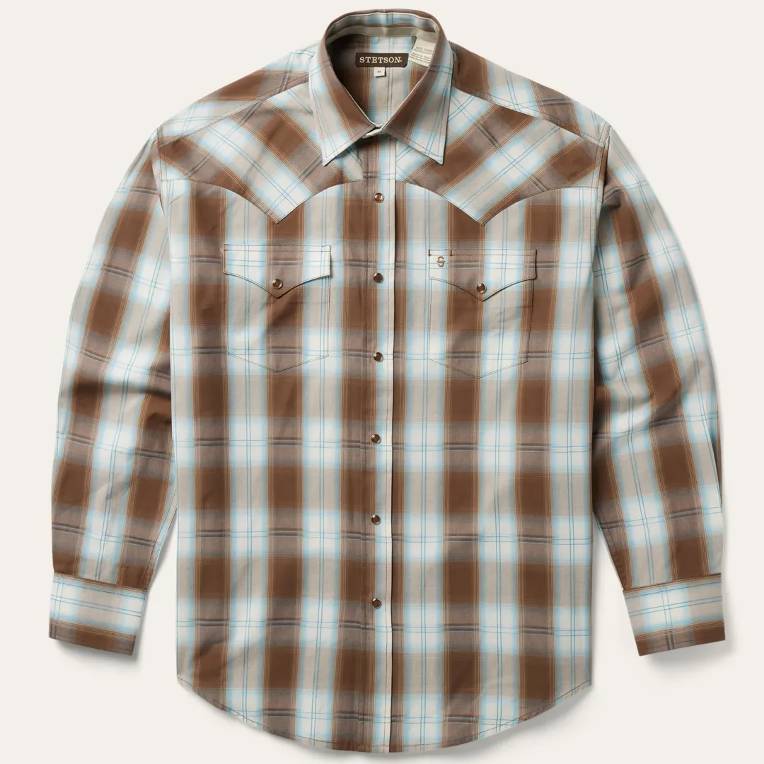 This Western shirt is crafted from a rich yarn dyed Sand Ombre plaid with an eye-catching satin stitch. It features a one-point ultra-deep curved back yoke, logo pearl snap front, and three snap cuffs. The front left pocket is adorned with the Stetson “S” logo and the right sleeve placket is embossed with “STETSON”. It has multi-colored inside trim fabrics and is made with 100% cotton for quality, breathability and comfort.