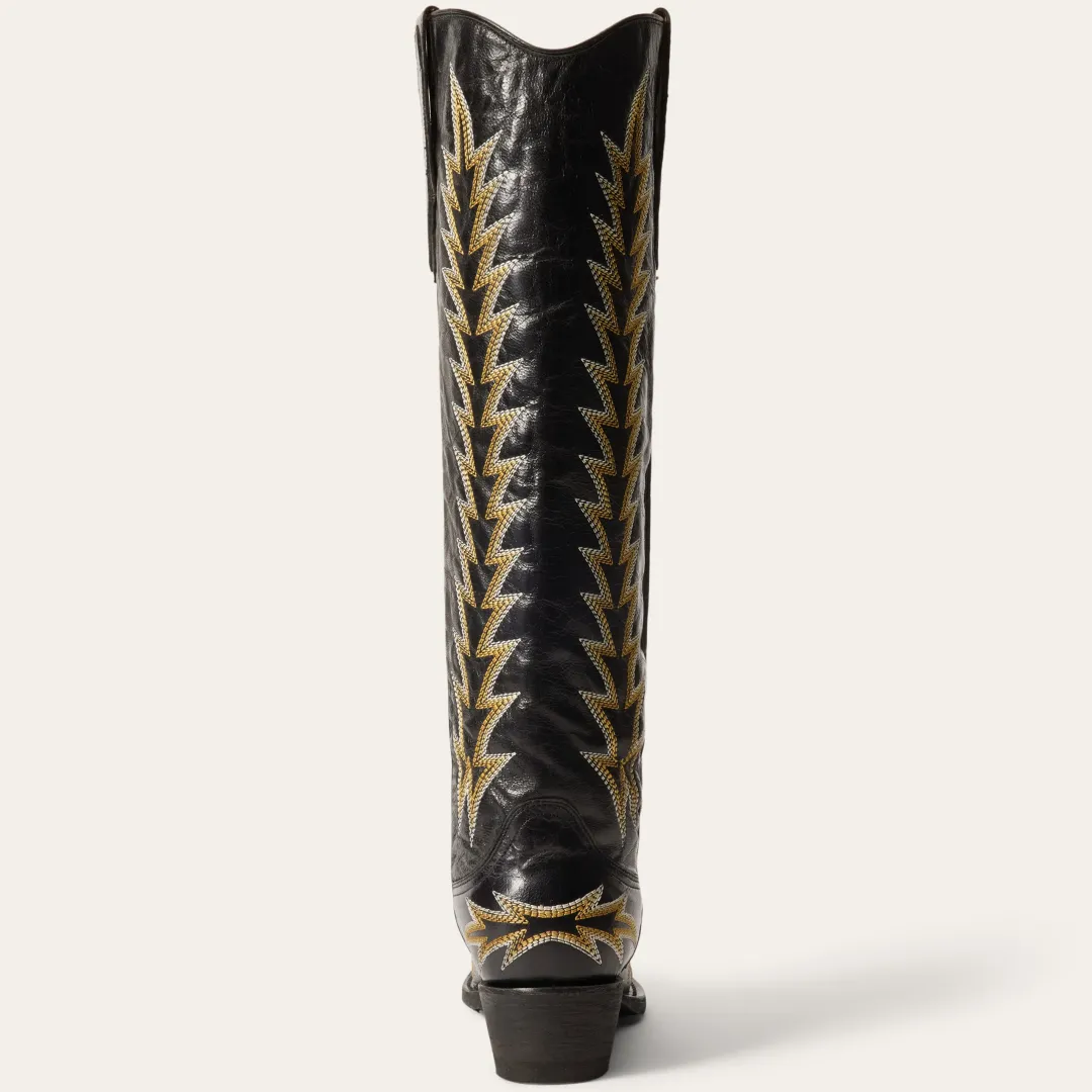 The statement-making Sarah Boots have a Goat Leather Vamp and 18” Shaft and a unique vintage flame embroidery. Additional details include a stacked heel, premium leather lining, premium brass nails and hand-driven lemonwood pegs that enable the boot to withstand the elements by expanding and contracting with any moisture the boot may encounter.Our western boots are handcrafted with the same care and consideration that goes into our legendary headwear, resulting in the ultimate mix of heel-to-toe comfort, durability, and classic Western style. Their rugged construction is fit for a lifetime of adventure, with high-quality leathers that will develop an attractive patina over time and conform to the wearer, providing years of reliable service.