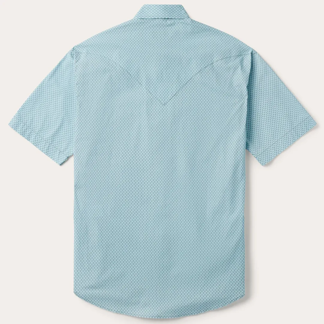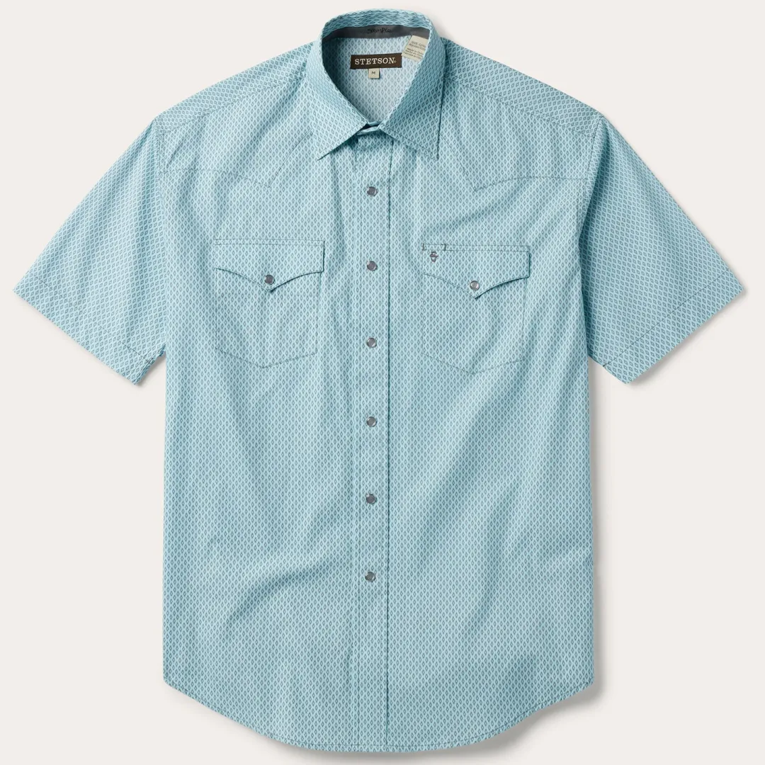 This Western-style shirt is crafted from crisp, lightweight 100% cotton poplin printed with an eye-catching allover Silver Diamond Neat pattern. It features a one point ultra deep curved back yoke, the Stetson “S” embossed on the front left pocket, and “STETSON” embossed on the right sleeve placket. The classic snap front features logo snaps, while the solid poplin inside trim provides a subtle contrast.