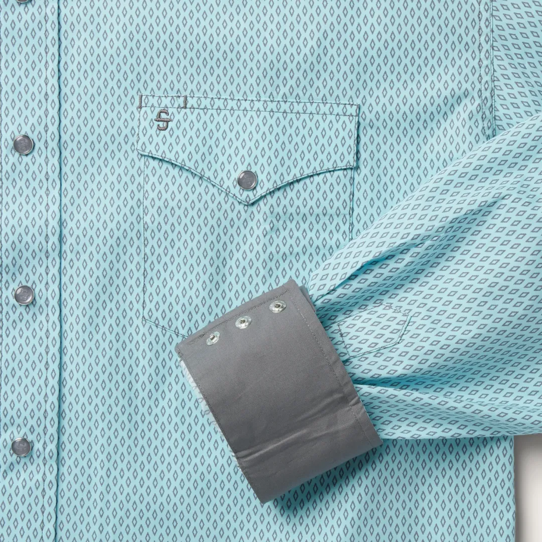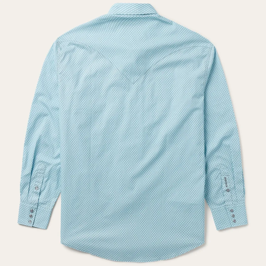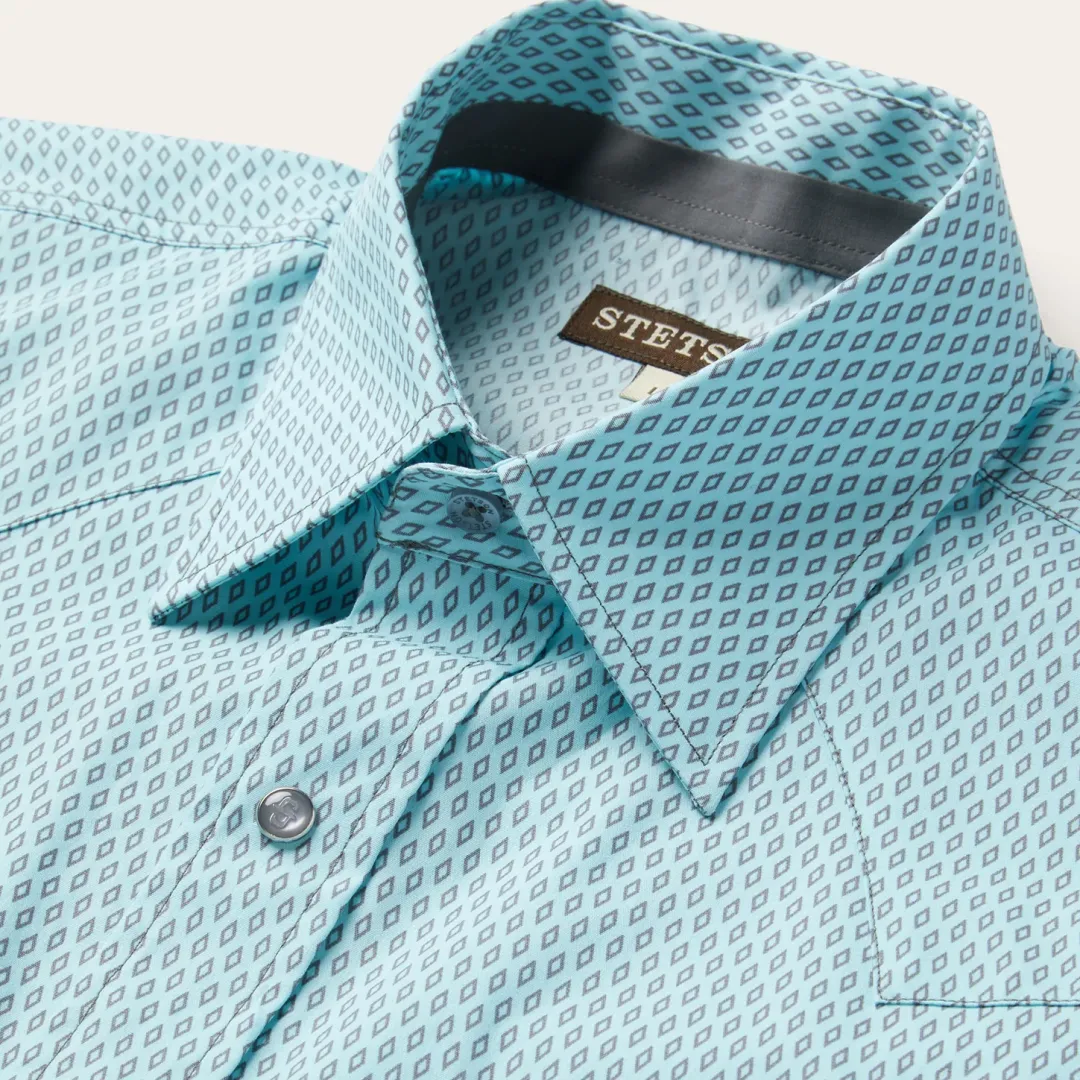 This Western shirt is crafted from a lightweight cotton poplin with a Silver Diamond Neat allover print. It features a one-point curved back yoke, logo snap front, and three snap cuffs. The front left pocket is adorned with the Stetson “S” logo and the right sleeve placket is embossed with “STETSON”. It has a solid poplin inside trim and is crafted with 100% cotton for quality, breathability and a soft feel that will only get better with age.