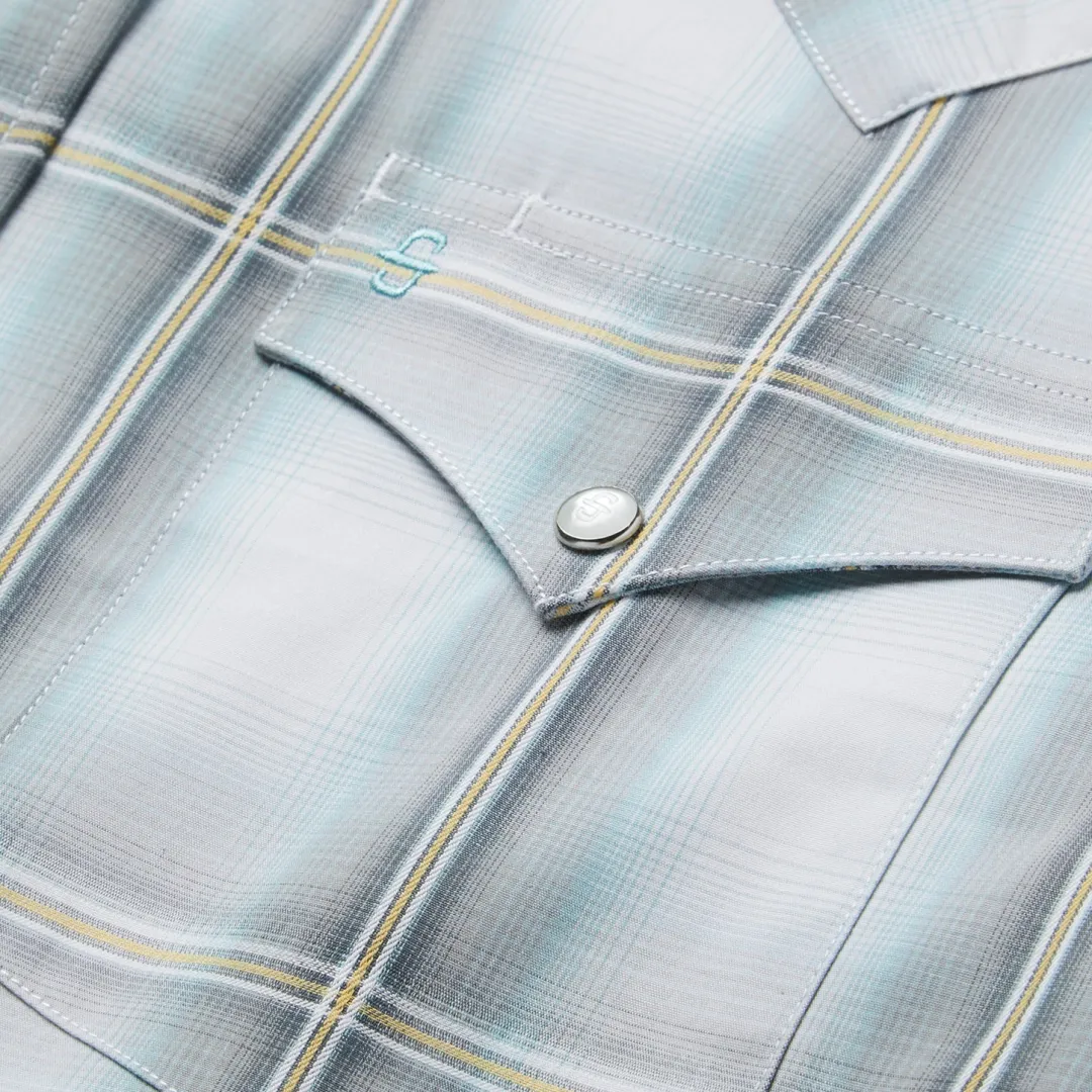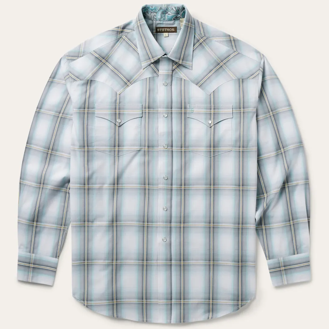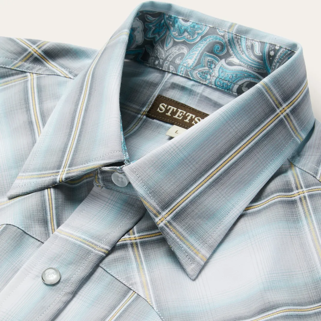 This Western shirt is crafted from a yarn dyed Gray Sky Hombre plaid with satin stitch. It features a one-point ultra-deep curved back yoke, logo snap front, and three snap cuffs. The front left pocket is embossed with the Stetson “S” logo and “STETSON” is embossed on the right sleeve placket. It has a contrast inside trim and is made with 100% cotton for quality, breathability and comfort.
