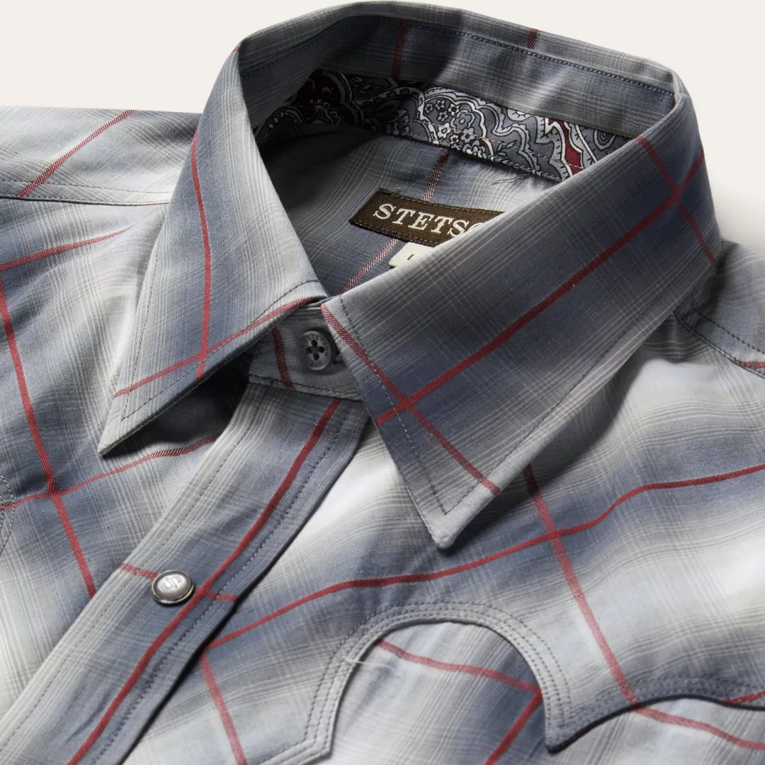 This Western shirt is crafted from a yarn dyed Smoke Ombre plaid with satin stripe. It features fancy front and back yokes with triple needle stitching, a Stetson “S” logo embossed on the front left pocket, and “STETSON” embossed on the right sleeve placket. It has a contrast inside trim, 3 snap cuff, and classic snap front featuring logo pearl snaps. Made from 100% cotton for quality and breathability, it has a feel that will only get better with age.