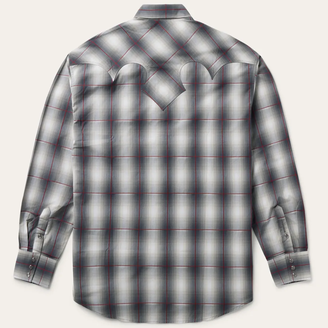 This Western shirt is crafted from a yarn dyed Smoke Ombre plaid with satin stripe. It features fancy front and back yokes with triple needle stitching, a Stetson “S” logo embossed on the front left pocket, and “STETSON” embossed on the right sleeve placket. It has a contrast inside trim, 3 snap cuff, and classic snap front featuring logo pearl snaps. Made from 100% cotton for quality and breathability, it has a feel that will only get better with age.