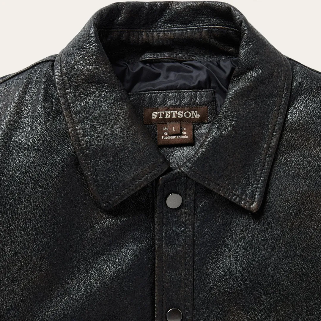 There’s only one Stetson and the same quality and attention to detail that goes into our world-famous boots and hats goes into our apparel. Built tough with high-quality leather, this distressed leather jacket is warm, rugged and durable, and features a fast-action snap front, straight back yoke, and snap-closure chest pockets.