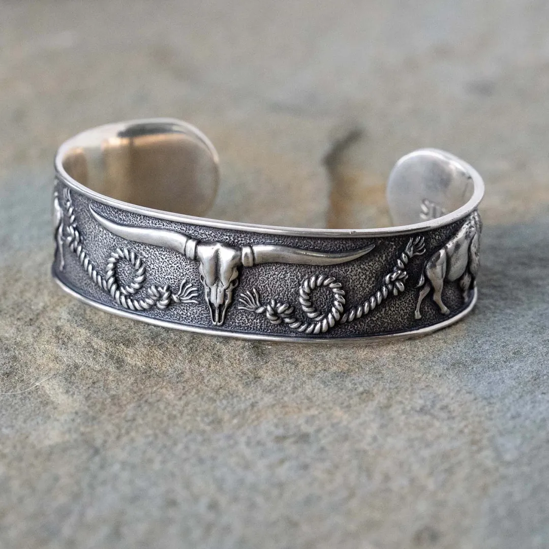 Classic Americana motifs decorate this Southwestern inspired cuff. The skull of a Longhorn sits front and center on the face of the cuff, flanked by knotted ropes, buffalo and horseshoes. Truly ornate, this cuff captures all the iconic elements of the rugged Southwest spirit. Wear this on its own, or layer with other pieces for a classic look.
