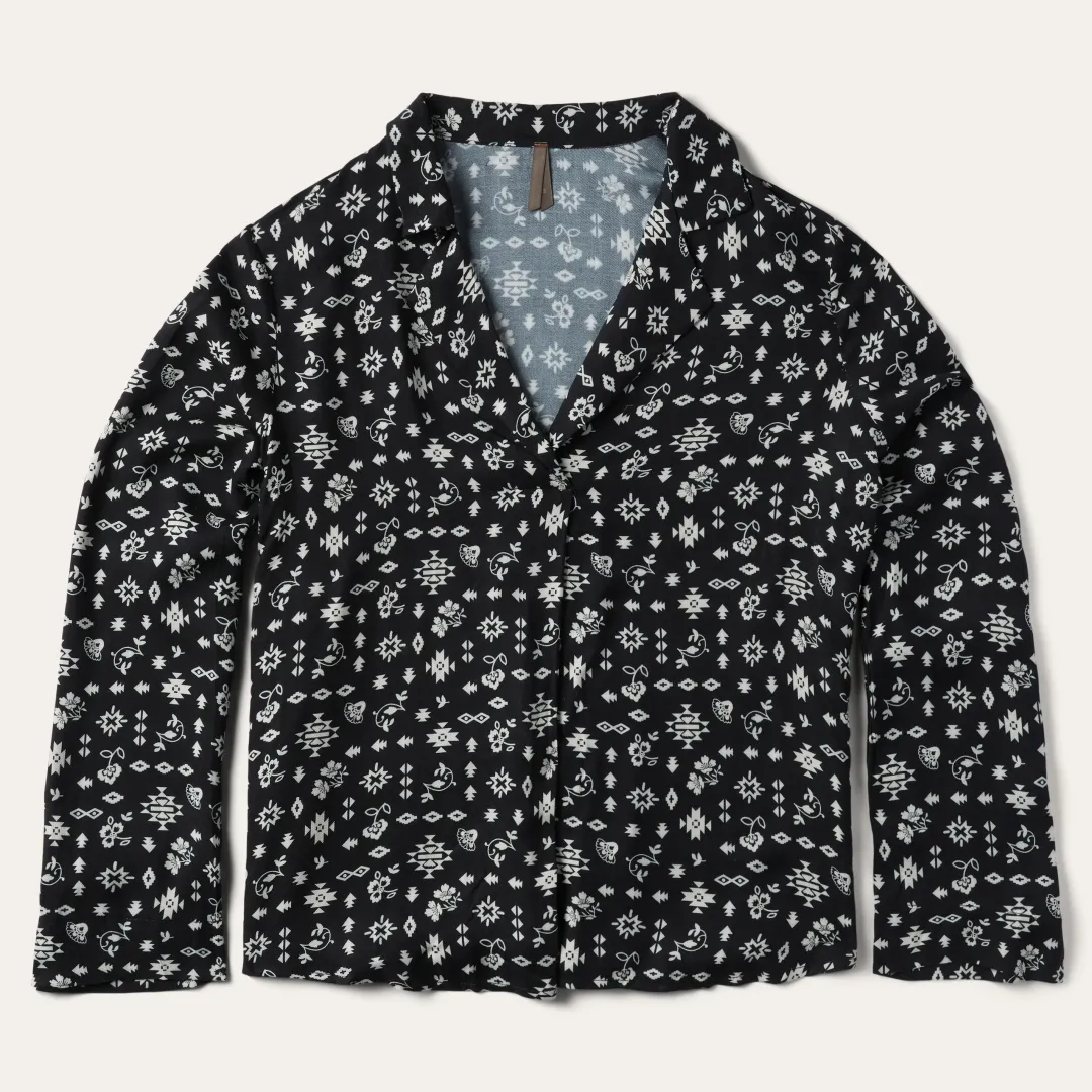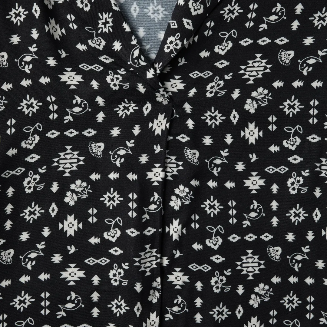 This pullover blouse is crafted from 100% rayon twill and features an allover Southwestern Ditzy print. It has an open notch collar with a V-neckline, long sleeves with a slight bell and a large pleat at the center front.