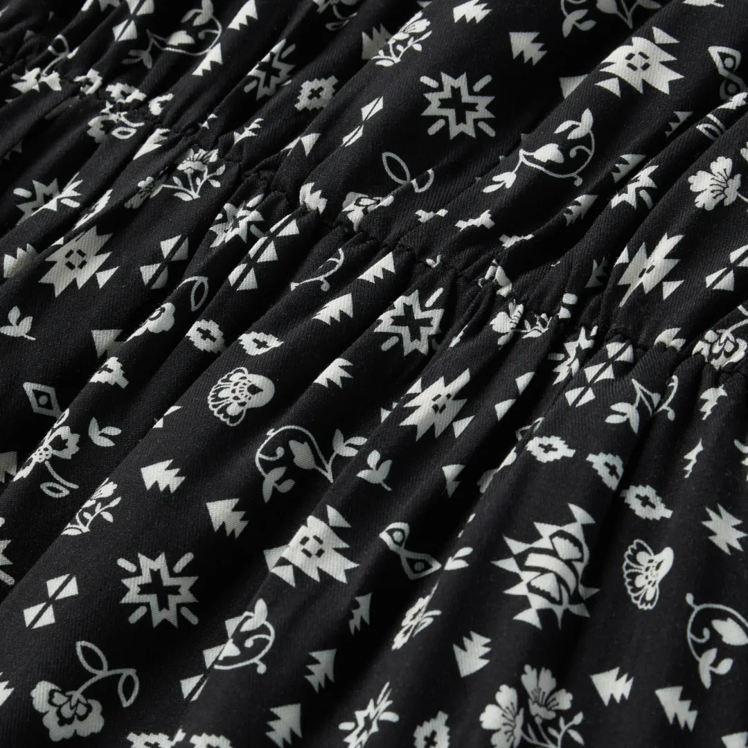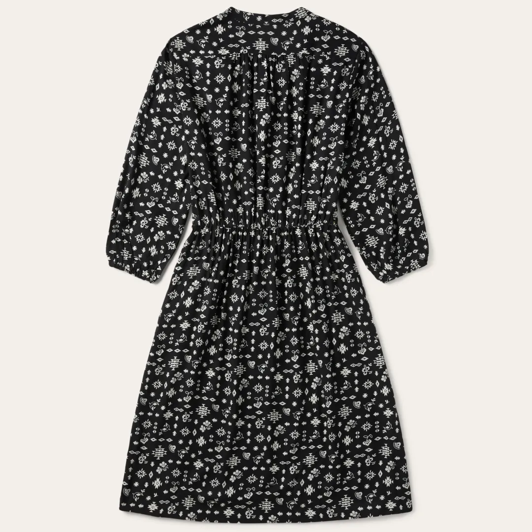 This eye-catching, mid-length, zippered dress is woven from 100% rayon twill and features an allover Southwestern Ditzy print. It has a stand collar with a V-neckline, a straight back yoke with gathers below the elastic waist, long sleeves with elastic cuffs and side seam pockets.
