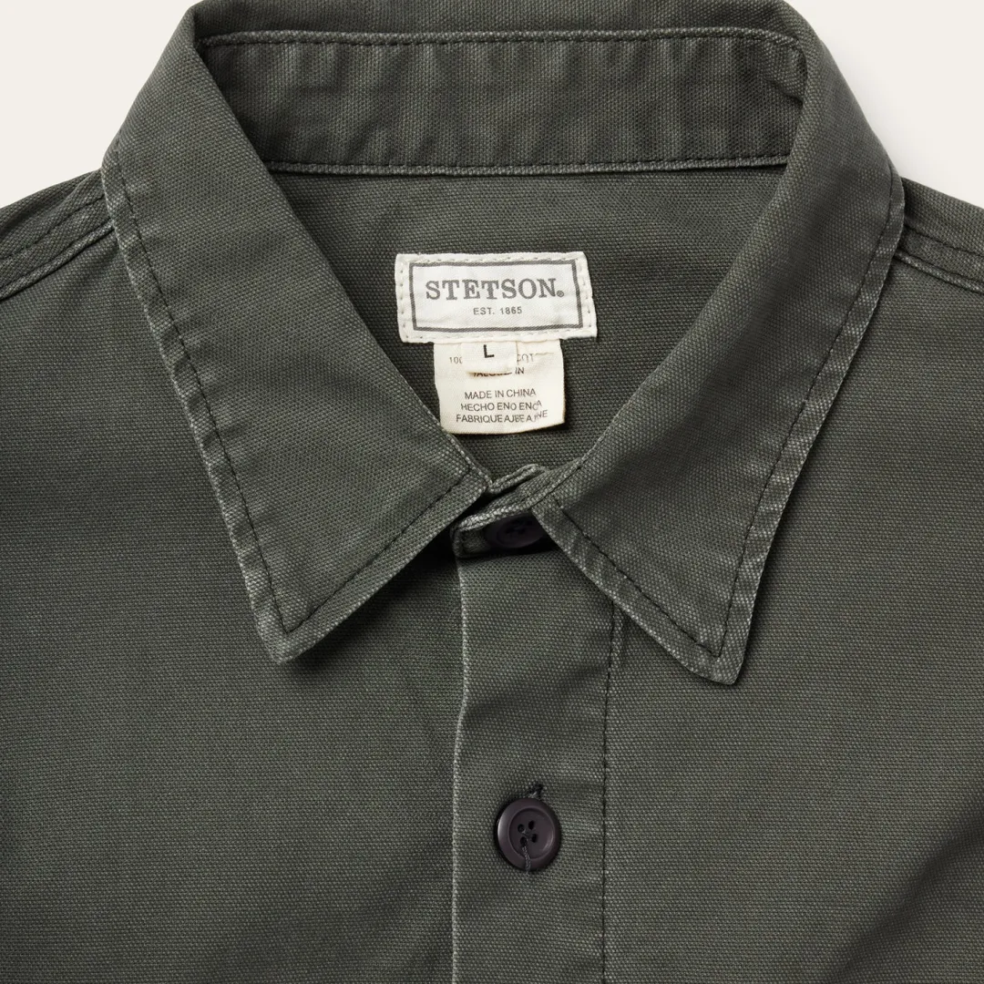 This snap front western shirt is crafted from 100% cotton and features a yarn-dyed rustic plaid with satin stitch. Two snap-closure pockets, a spread collar, contrast inside trim Rugged and stylish, this canvas shirt jacket is crafted from a durable cotton canvas with just a hint of stretch. It has a spread collar and a straight back yoke, while its front features large rectangular mitered chest pockets and flaps and button closure, straight hem and a one-button cuff. At Stetson, we use the toughest materials and fabric to provide you with the best Western outerwear for men who spend their days in the great outdoors.