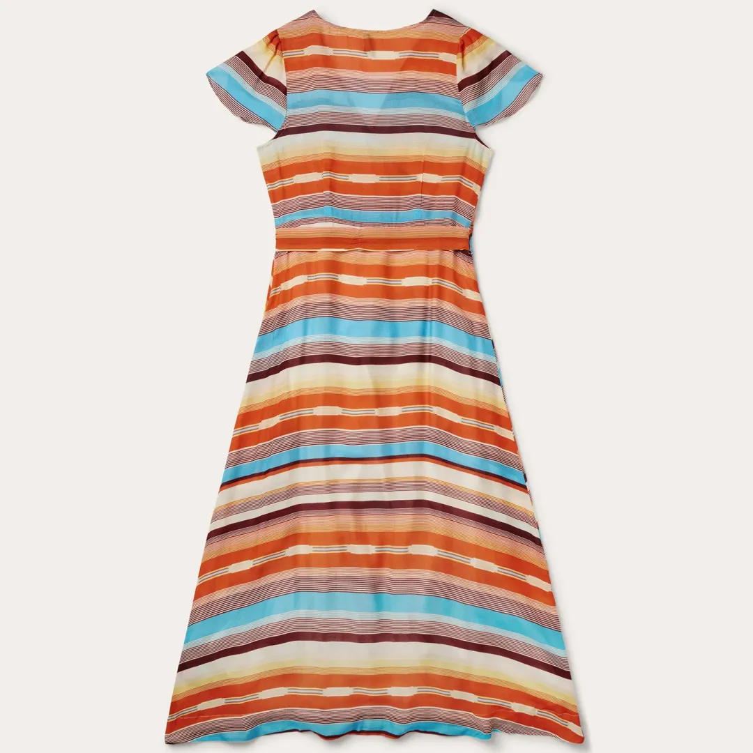 This vibrant, stylish wrap dress is crafted from soft, lightweight 100% rayon and features a rich, colorful Sunset Serape print. The wrap front design has a self tie closure, with back and bust darts on the bodice for a flattering fit. The short tulip sleeves provide just the right amount of coverage, while the vibrant allover print provides plenty of Western-inspired style.