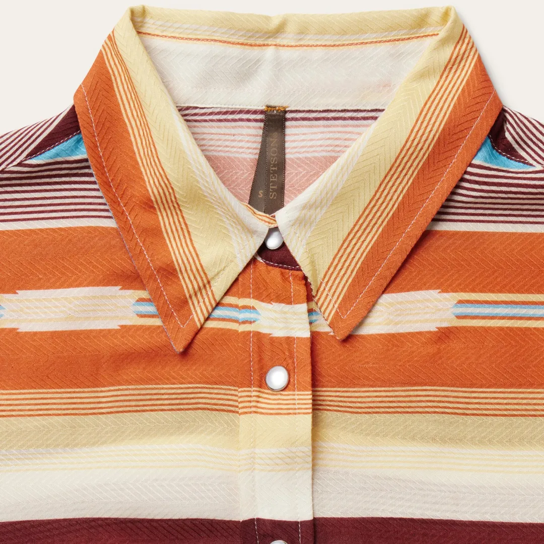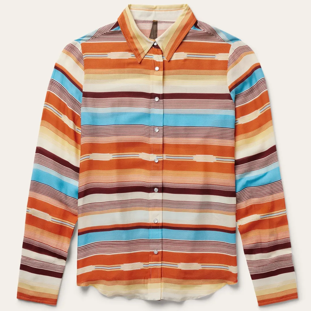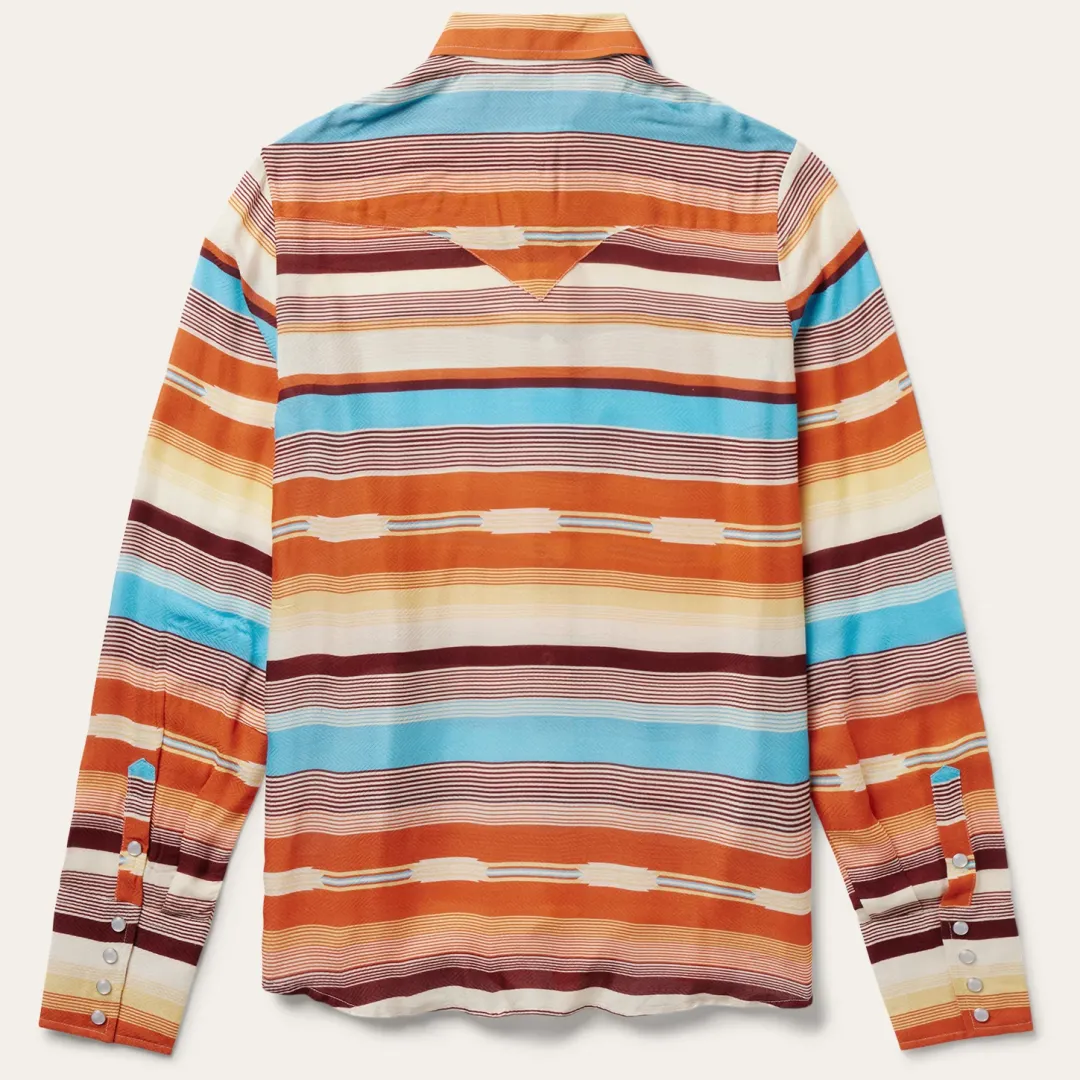 This stylish Western-style long sleeve blouse is crafted from smooth, soft 100% rayon herringbone and features a rich, colorful Sunset Serape print. Authentic style features include a single point deep curved back yoke and a full snap front. Lightweight and breathable with a flattering fit, it has bold, eye-catching style that’s perfect for casual day and evening wear.