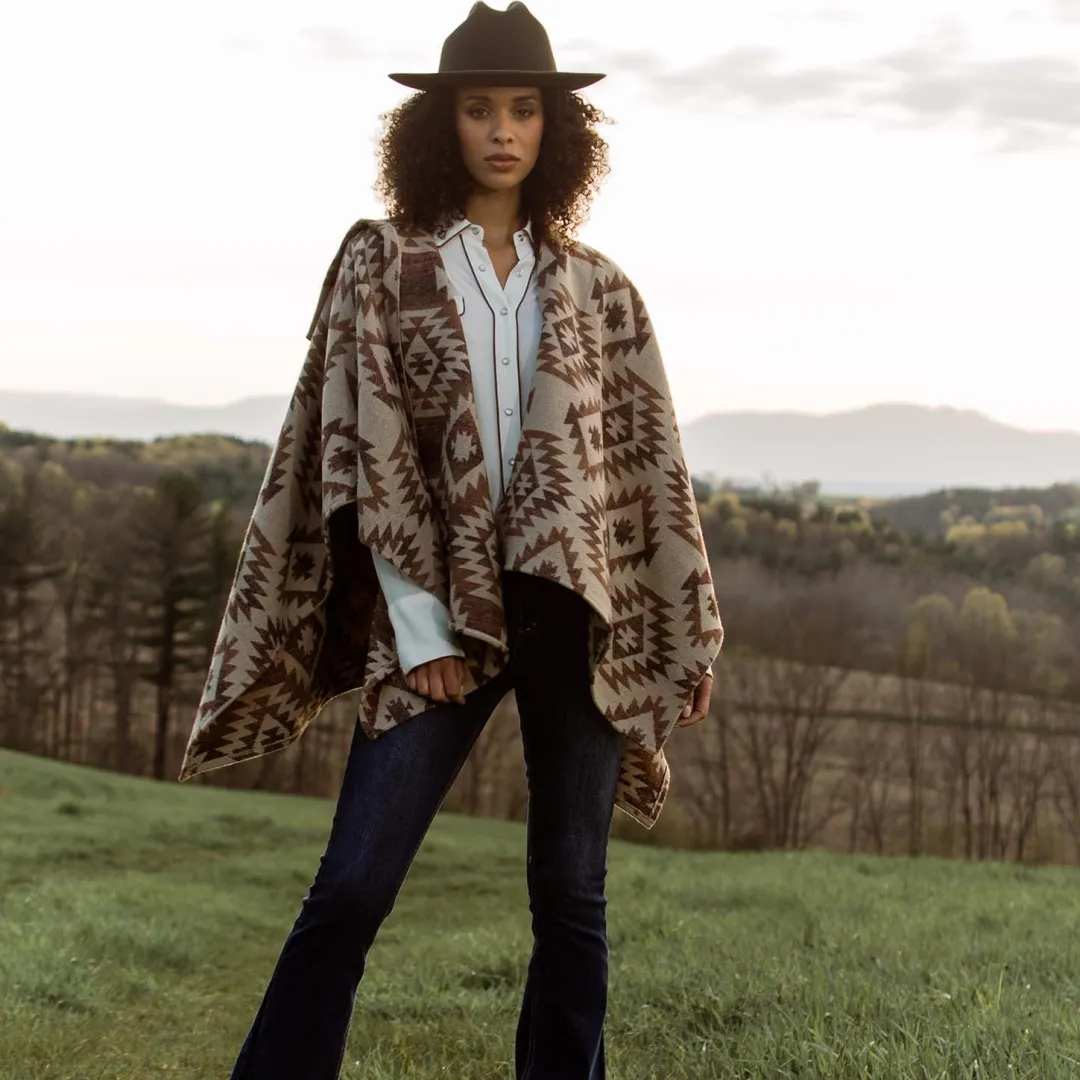For those days when you just want to cozy up, this brown and rust toned serape blanket wrap with hood has you covered. Pair with jeans and your favorite boots to bundle up in style.