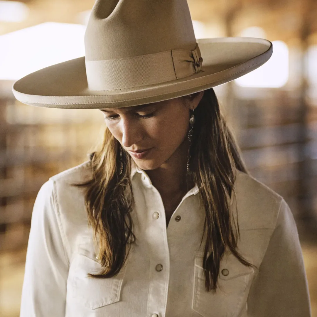 Complementing its genuine leather sweatband and full satin liner, the Tom Mix is finished with a wide grosgrain hat band and branding-iron hat pin bearing the initials “JBS”, a nod to our founder, John B. Stetson, whose pioneering legacy lives on in every hat we sell.