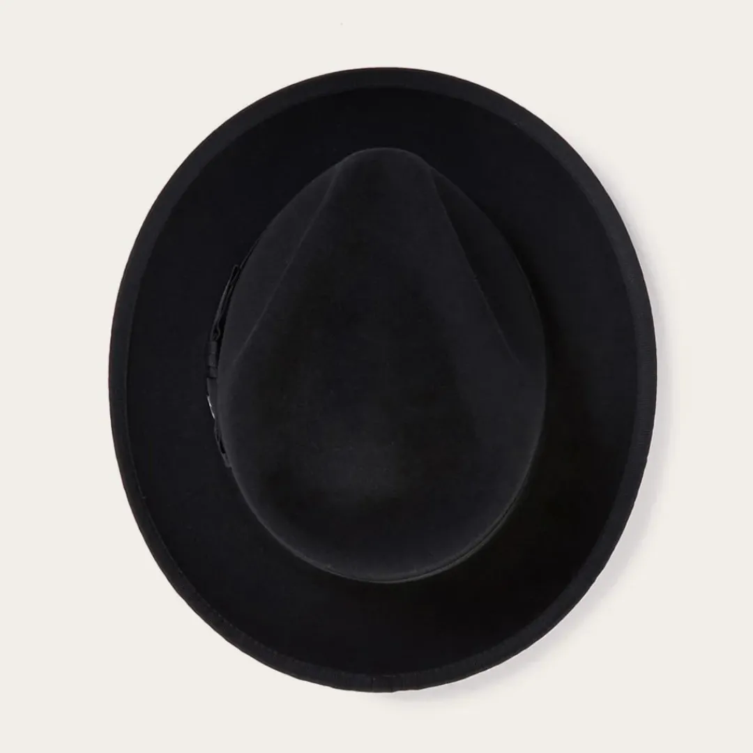 The Whippet Fedora is constructed of firm finish, fur felt and features a pinchfront crown, bound edge brim, interior cowhide sweatband and grosgrain hat band with feather accent.