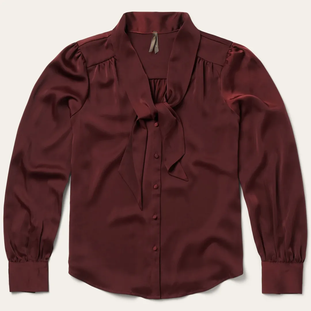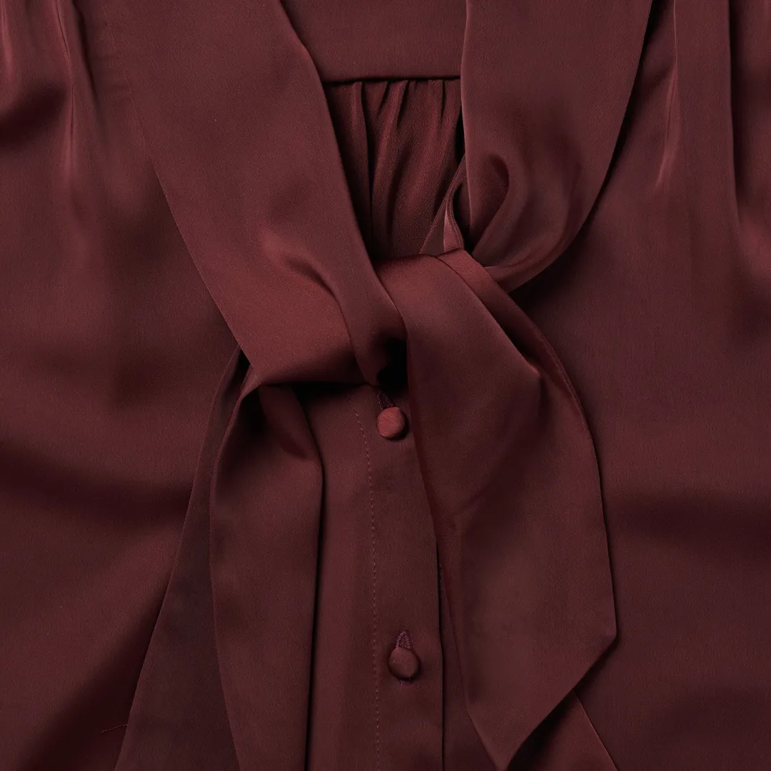 This stylish v-neck satin blouse features a flattering, free-flowing fit for ease of movement and a rich wine color. It has a self-tie collar and self-covered button front placket, straight front and back yokes with gathers below and long sleeves that are gathered into the shoulders. Day or evening, dressed up or with jeans, its versatile style and comfortable feel will make it one of your favorite go-tos.