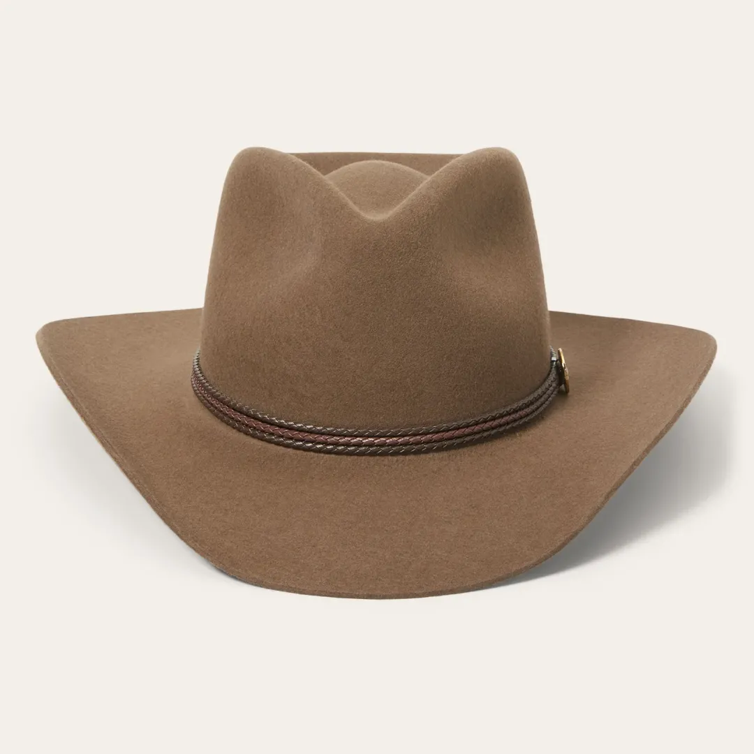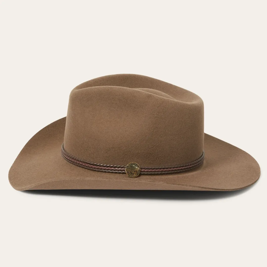 Handmade with pride in Texas, the Woodrow is a statement-making style crafted with a firm finish from high-quality 100% wool felt. It has a 4 1/4” pinch front crown, 3 1/4” brim and a three-cord braided leather hatband and Buffalo nickel pin. A full satin liner provides luxurious comfort and while an absorbent DRI-LEX® sweatband provides a cooling, secure fit.